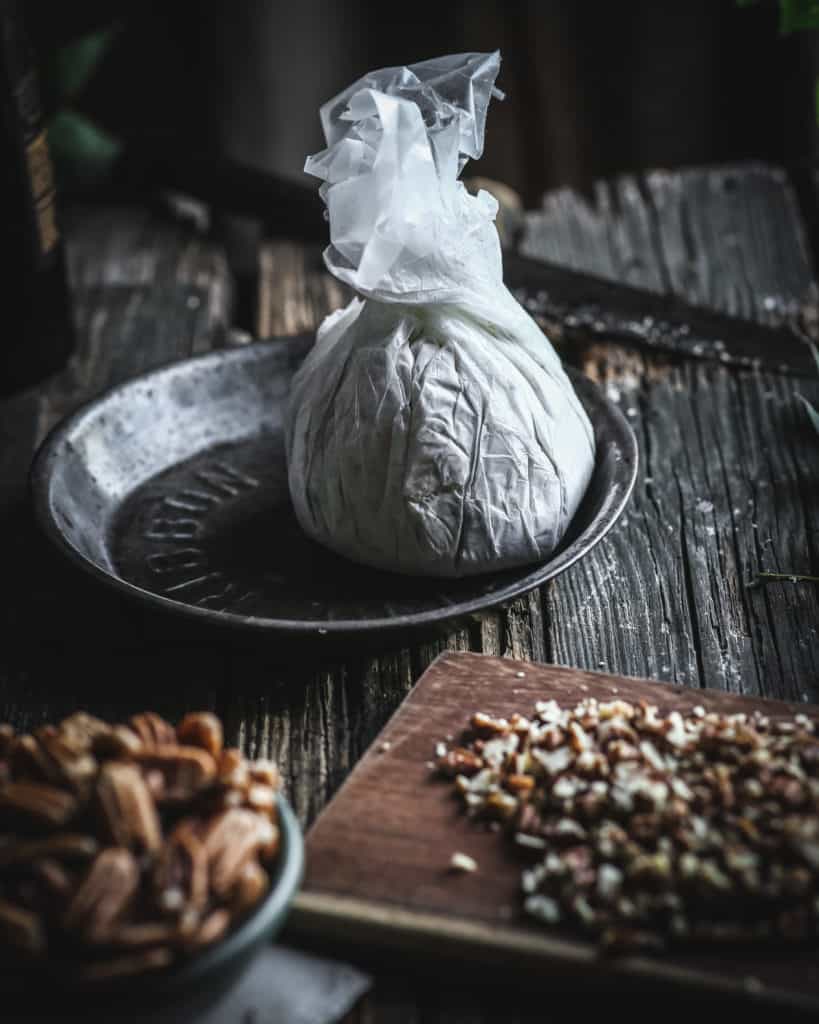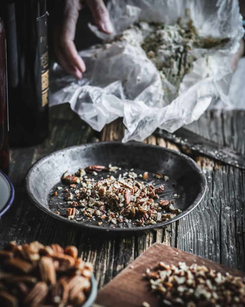 Place the chopped pecans in a shallow pie dish. Using a rubber spatula, gather up the cheese mixture by scraping the sides of the bowl (Don’t forget any cheese that may have collected on the mixer beaters!) Place the cheese on a piece of waxed paper and gather up the edges, twisting them together at the top (see pic above.)