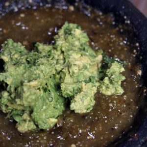 pan-seared-filet-roasted-tomatillo-guacamole May 17, 2017 By Melissa Guerra Leave a Comment Mashed avocados on top of salsa in molcajete