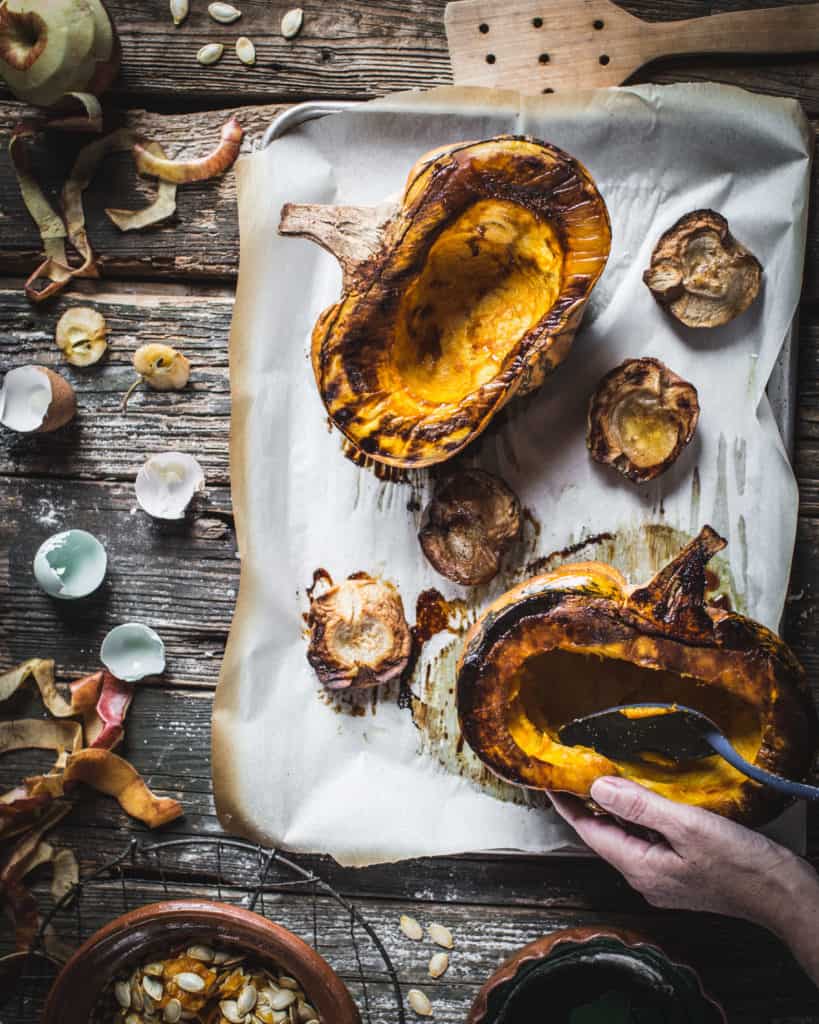 Sometimes you can buy pumpkins already cut into portions. If not, bread knives work fairly well as a pumpkin saw. Only use gentle force please; don’t try to hack or chop the pumpkin in half. And for heaven’s sake, don’t stab at the thing. I promise you, brute force with a pumpkin will go horribly wrong.