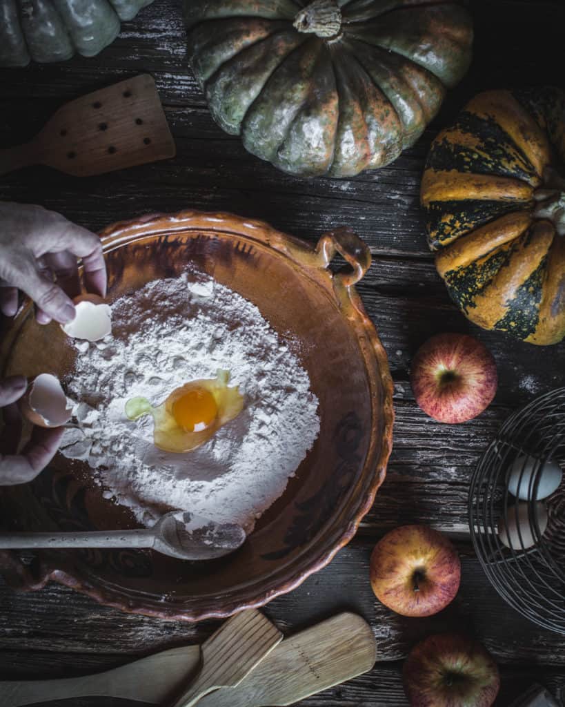 Once they are roasted, remove the pumpkin and apples from the oven, and allow to cool completely. Using a large spoon, scoop the pumpkin flesh out of the pumpkin skin. You will only need 1 lb. (500g) of the pumpkin flesh. If you have leftover, freeze it for later use. Chop the apples into a ½” (1cm) dice. Place the pumpkin and apples in a large bowl and add the cinnamon. Stir to combine well. This should be a chunky mixture, but not too chunky.