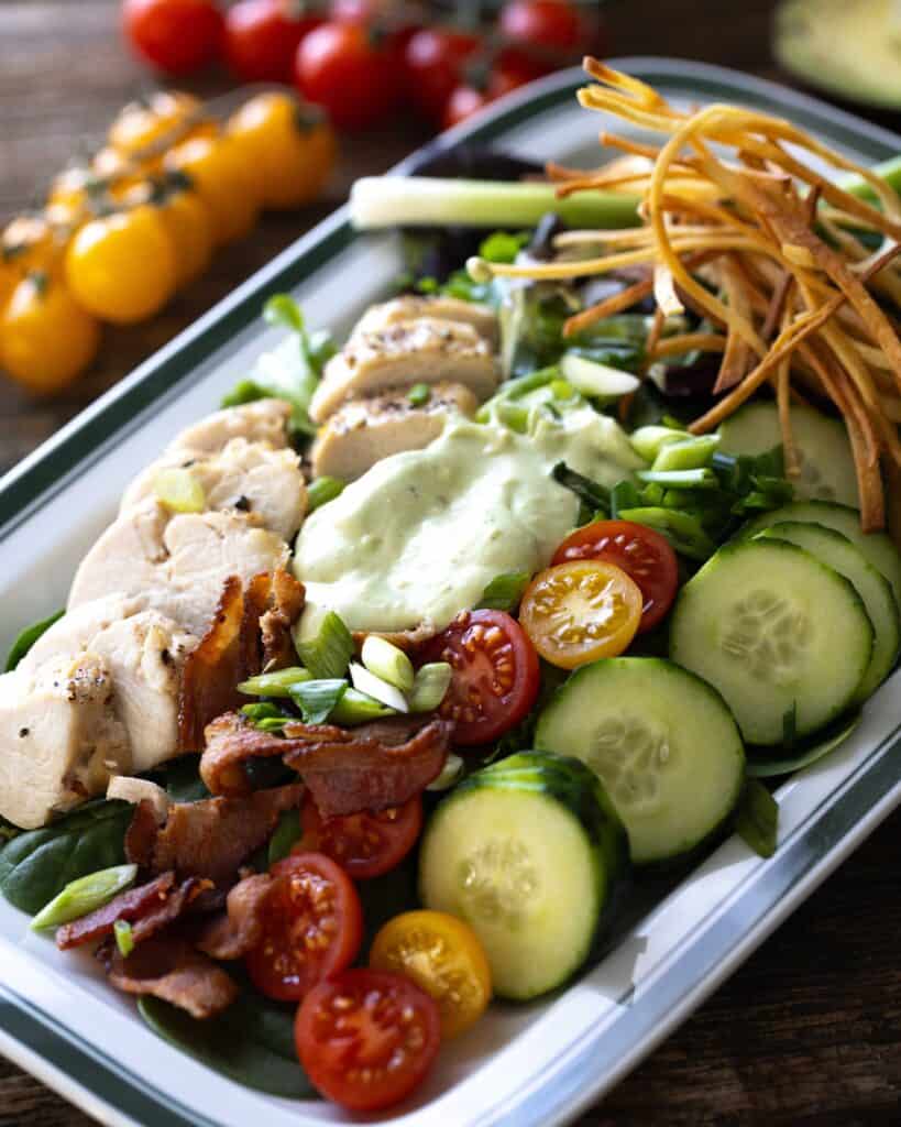 platter of salad with avocado ranch dressing