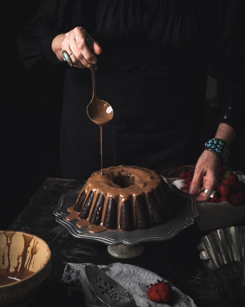 You can see from the photos that pouring the milk onto yout Chocolate Tres Leches Cake can be a little messy. I recommend that you use a cake plate that is deeper than the one I am showing in the photos. Sometimes photographers make decisions based on what props look like, as opposed to the practicality of a dish. I did have quite a time cleaning up all of the sticky leftover chocolate!