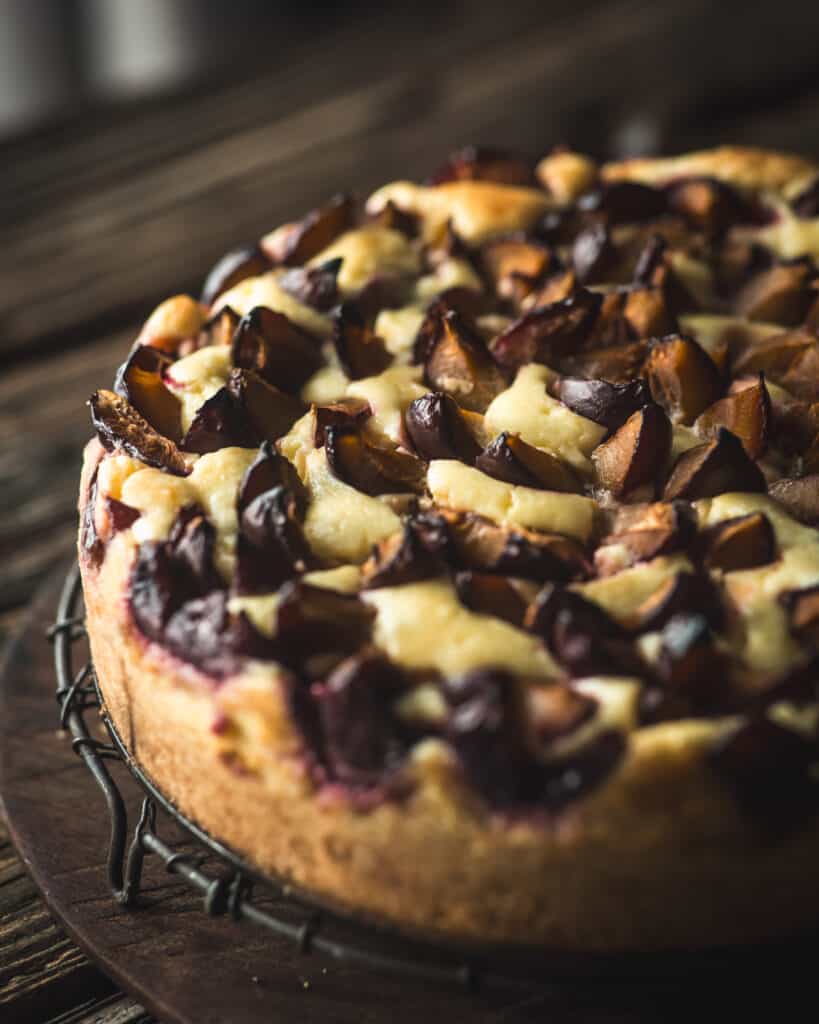 Arrange the prepared plums in the cream cheese filling. Place the cake in the preheated oven and bake for 75-90 minutes until a toothpick comes out clean from the center. Remove the cake from the oven and allow to cool completely.
