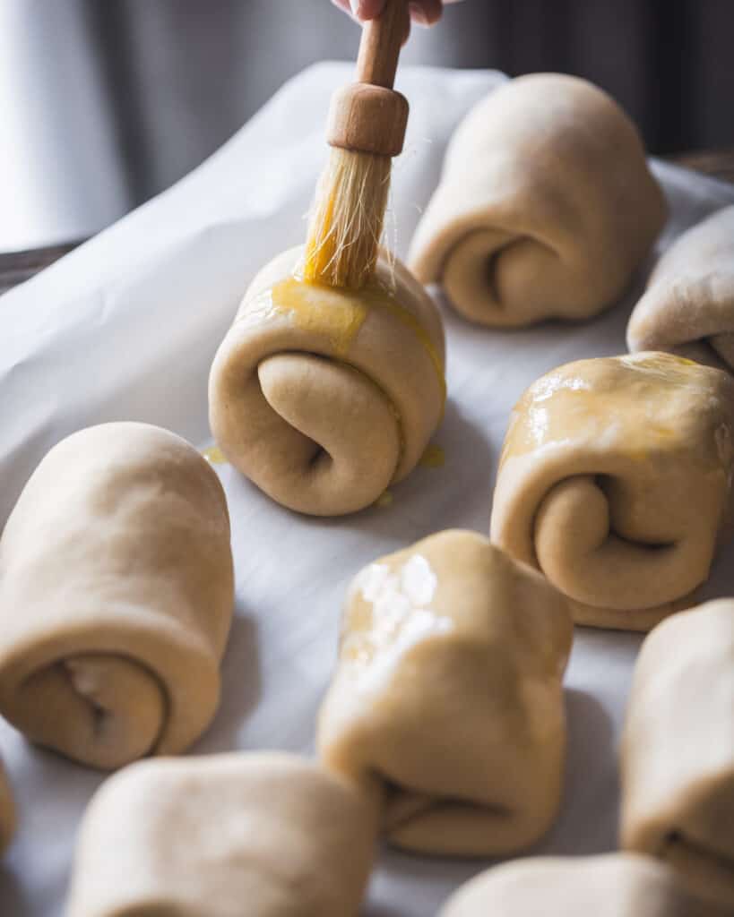 Cut the sausages into 2.5″ lengths (76cm). Take each portion of dough, and shape into a ball. On a floured surface, roll each ball into a flat circular shape. Place a segment of the sausage on the oval, and shape the dough around the sausage to form the klobasnek. Line a baking sheet with parchment paper, and allow the klobasniki to rise for 40 minutes. Preheat your oven to 350°F (176°C).